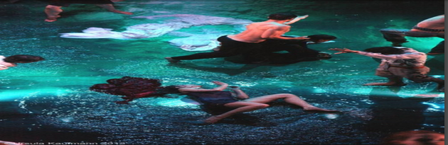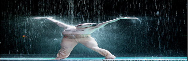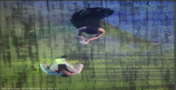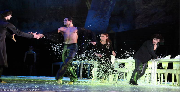 One of the most striking scenes in Jochen Ulrich’s Campo Amor ballet involves dancing in water, turning the stage into a shimmering, emotional landscape. In the climactic moment, after Tancredi unknowingly kills Clorinda, the stage transforms into a blue-green pool, evoking a “sea of tears.” Water pours from above, flooding the space as dancers representing souls and memories move through it in a haunting, almost ritualistic choreography. The imagery draws heavily from the Orpheus myth, with Tancredi trying to retrieve Clorinda from the realm of the dead, only to be overwhelmed by grief and illusion.